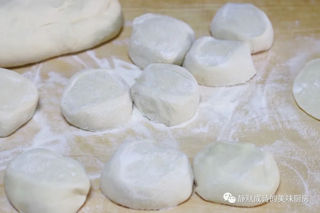 7、待面团发酵至两倍大,放两克食用碱进去,把面与碱揉匀,加了食用碱的发酵面食吃起来面香味儿更足。然后分成小剂子,擀开。