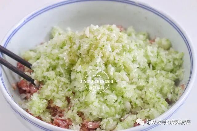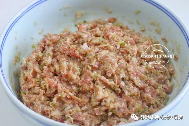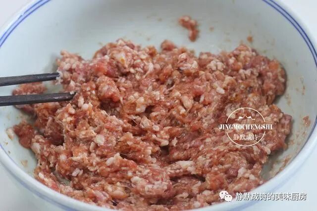 用花椒水给羊肉馅儿去膻提香的过程,也是给肉馅儿打水的过程,可谓是一举多得,这一步,是整个操作过程的重点。