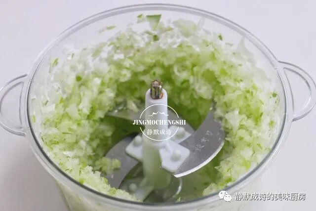 3、把大葱剥好洗净切成小段,放进料理机把葱打成葱末,不建议用手去切去剁葱,会刺激到眼睛。