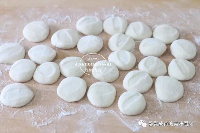5、把面团搓成长条,切开成小面剂子,一一擀成饺子皮儿。