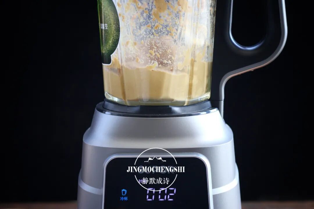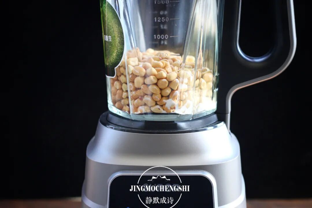 3、把熟花生米放进破壁机(是的,这里一定是用破壁机的,其他料理机很难做出细腻的花生酱来),然后把盐也加进去(不加也行,看个人喜好),使用它的搅拌功能,按下开始键。记住这里无需再额外加食用油,花生本身油脂就多。有人喜欢加花生油进去当启动剂,其实是多余的。只要一分多钟,花生米就被打碎成酱了,在机器旁边,就能闻到浓郁的香气。如果觉得花生酱不够细腻,可以再来一次。
