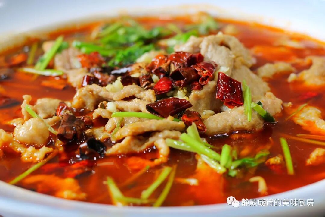 水煮肉片是一道四川菜,其独特的风味和丰富的口感深受食客们的喜爱。这道菜的主料是猪肉,切成薄片,再配以豆芽、白菜心等蔬菜,用辣椒和豆瓣酱等调料煮制而成。水煮肉片的口味麻辣鲜香,汤汁浓郁,肉质鲜嫩,入口即化。由于其麻辣的口感和略带一些汤汁的滋味,这道菜在国内外都非常受欢迎,特别是在冬季,这道菜更是餐桌上的佳肴。