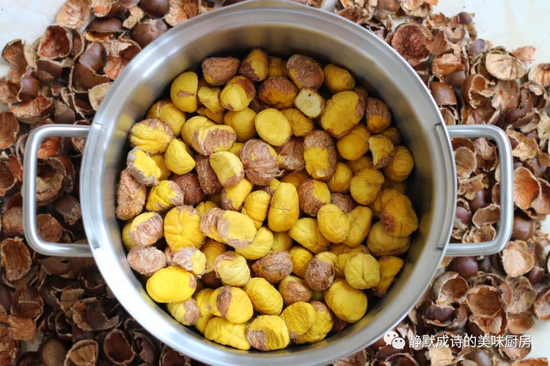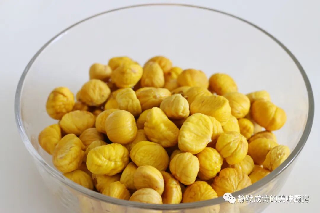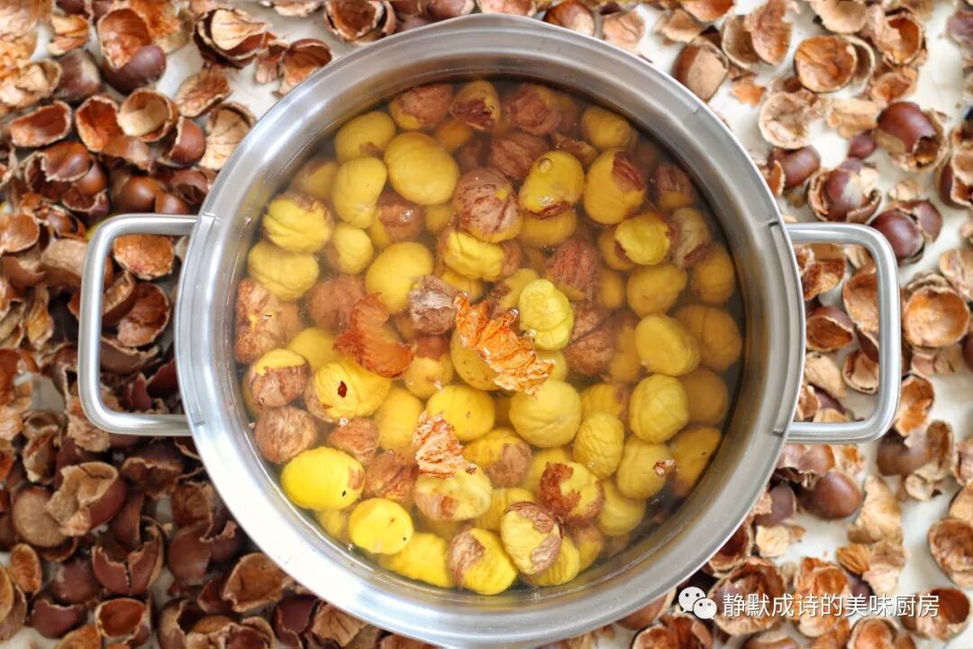 第2步:栗肉全部剥出之后,烧一壶开水,把它倒进去,泡四五分钟左右,你会发现,在热水的加持下,栗子的内膜与果肉会慢慢分离。