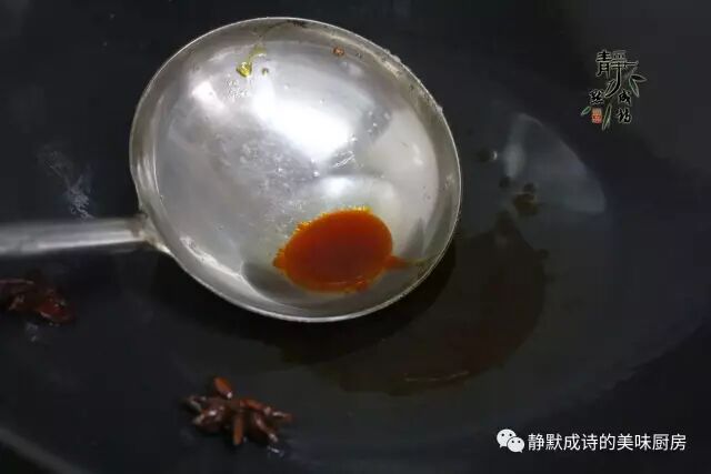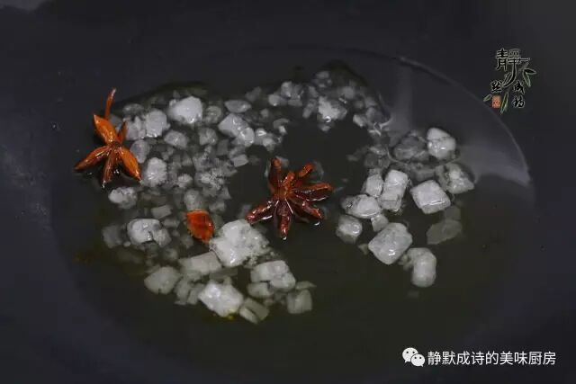 4、开始火上操作了。热锅凉油,下八角和冰糖,小火炒制。冰糖是很大颗也不要紧,不必把它捣细碎,因为它一遇热便会土崩瓦解。
