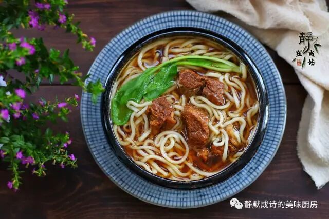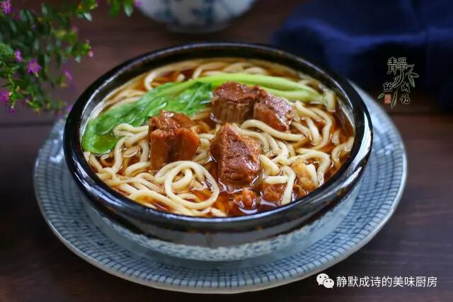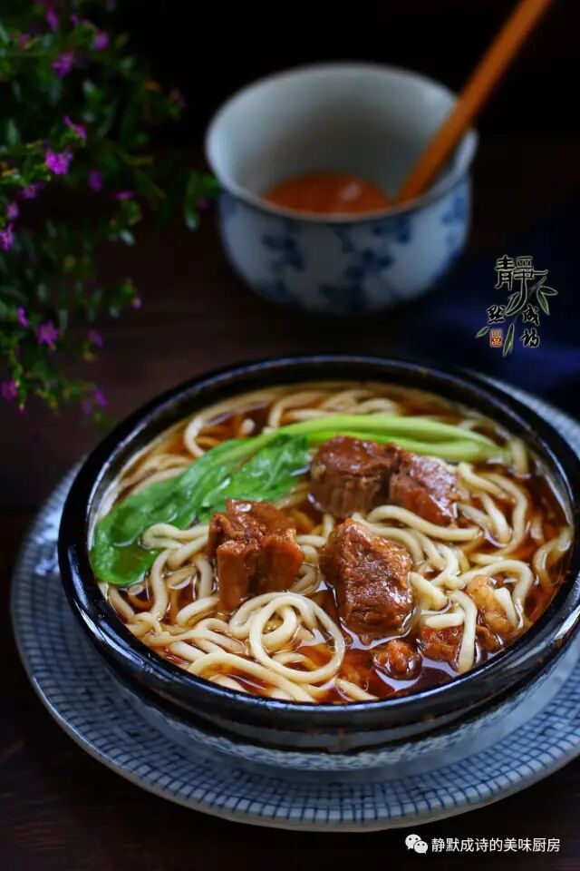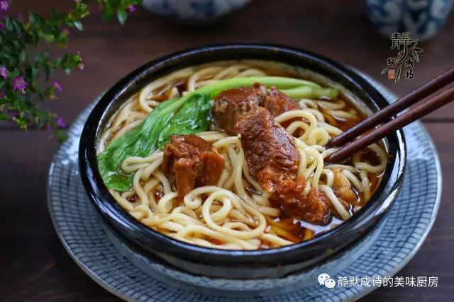 14、红烧牛肉有了,还愁吃不到牛肉面吗?煮好面条,烫好青菜,捞到装有牛肉汤的大碗中,再放几块香喷喷的牛肉,这碗面,您就麻利地开吃吧!想吃香辣味的牛肉面,那您就再放一勺辣椒油。外面一碗牛肉面最少也得二三十块钱,还是自己动手吃个实惠又放心。