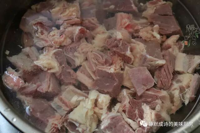 8、接着一次性添加清水,注意这里是一次性添足,并且是凉水而不是热水哦!因为牛肉虽经过浸泡,但它里面的血水并没有完全地泡出来,我们还需要通过添加凉水逐渐加温,逼出牛肉中未完全出来的血水,如果添加热水,那么牛肉蛋白一凝固,血水就出不来了。