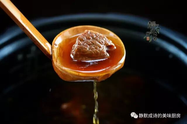 12、程序结束后,加盐调味儿,红烧牛肉就华丽丽地出锅了。看,它的肉软而不烂,汤汁红亮而清澈,绝好的牛肉面的汤头。当然,如果您说我只想吃红烧牛肉,那到这一步就成了,可以再倒锅把汁收一收。