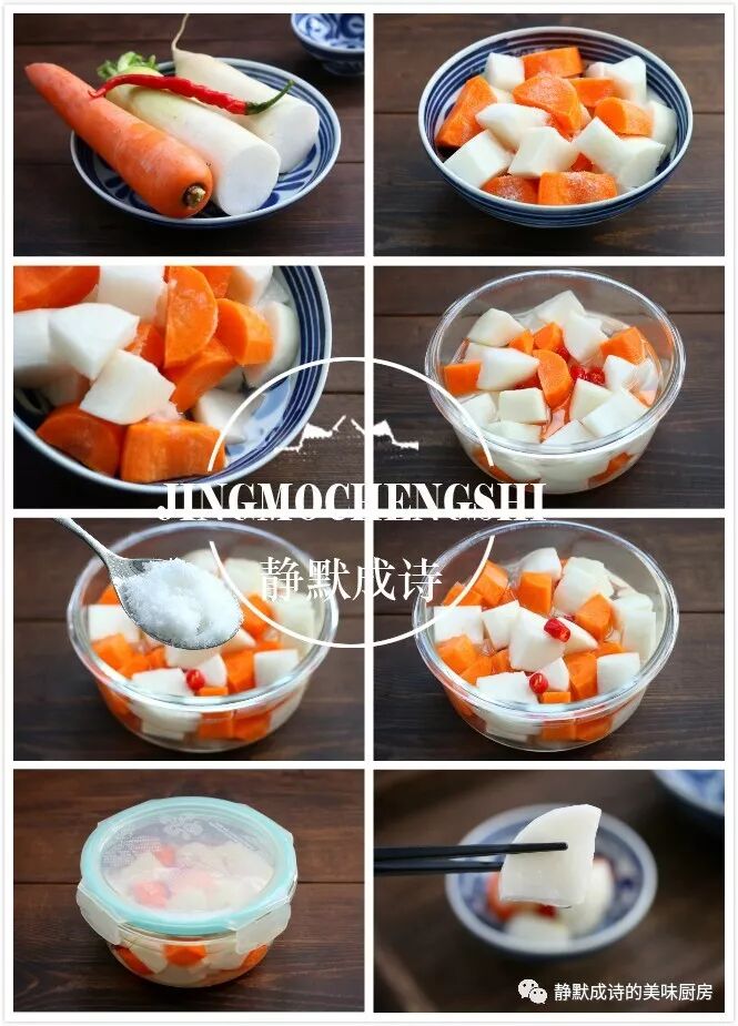【食材】:白萝卜和胡萝卜各1根、小米辣几个、白醋300毫升、白糖两汤匙、盐适量。