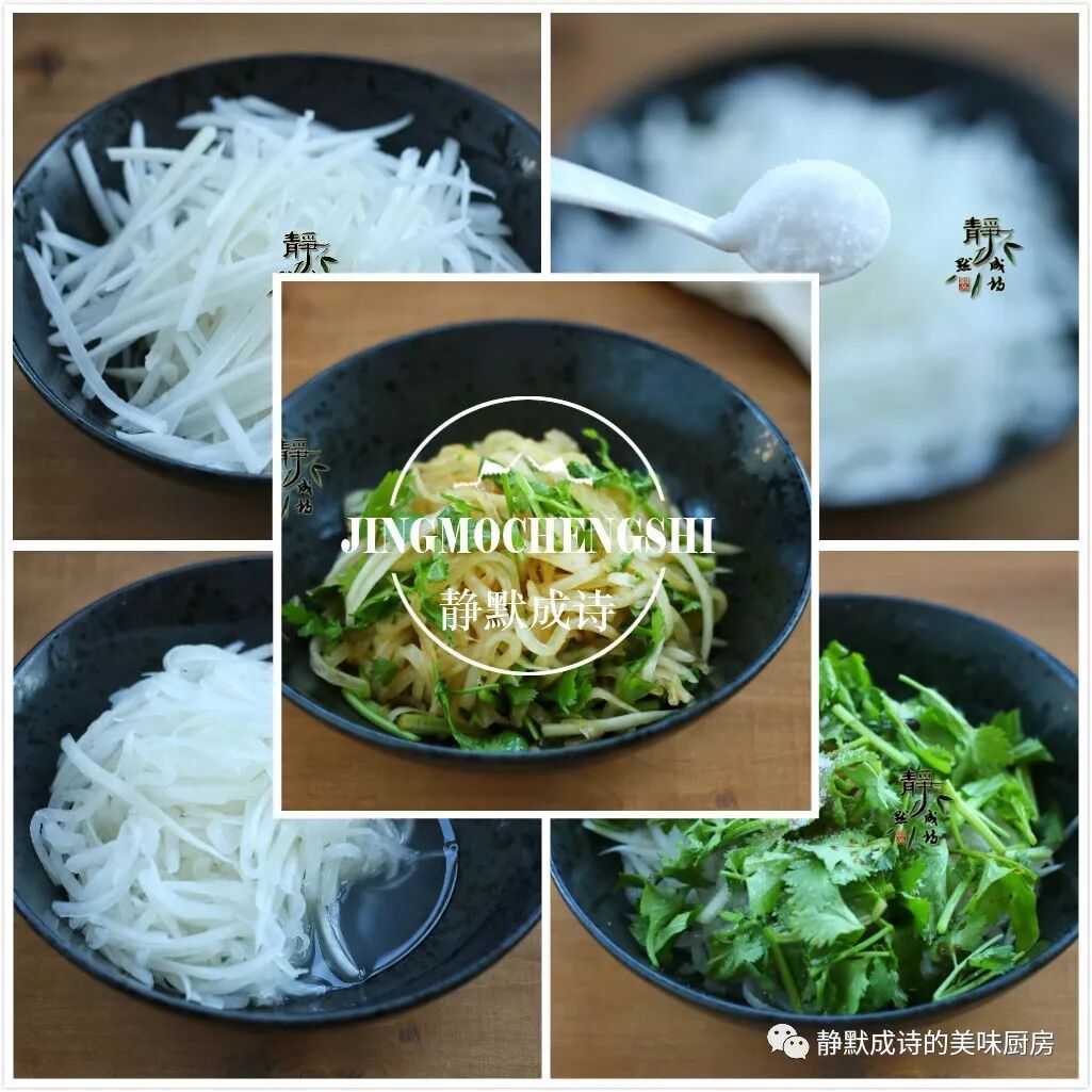 【食材】:白萝卜半根、生抽两汤匙、陈醋两汤匙、白糖半汤匙、盐适量、香菜两棵、香油少许。