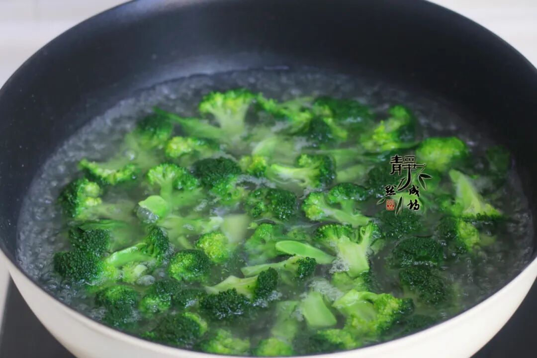 4、烧开水,淋入几滴油加入少许盐,接着把西兰花放入开水中焯烫两三分钟。喜欢软口的就多焯烫一会儿,喜欢脆口的就少焯一会儿水。