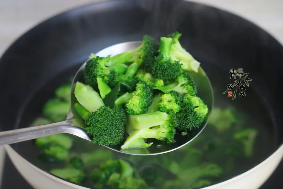 5、沥水,捞出,待用。水中加了油和盐,焯过水的西兰花也能保持碧绿的色泽。