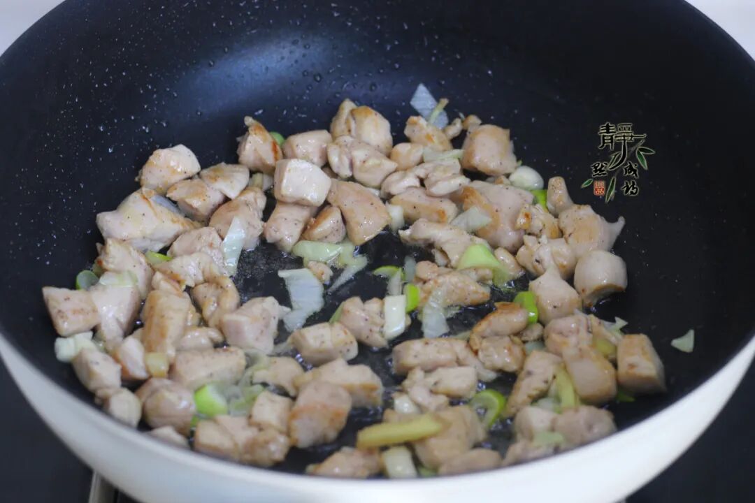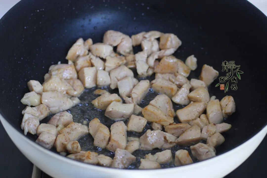 6、热锅热油,倒入鸡胸肉快速翻炒至变白。