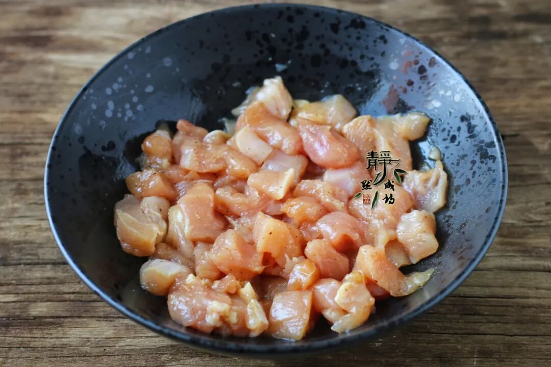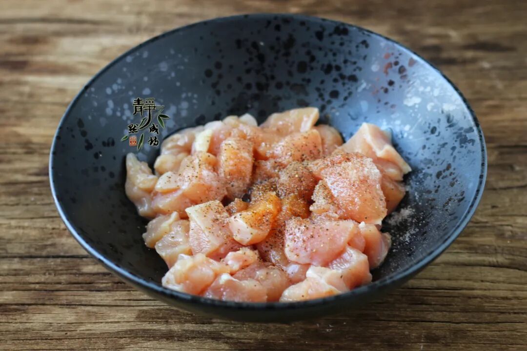 1、鸡胸半块儿,洗净沥水,切大小一致的小块儿,加入淀粉、生抽、盐、现磨黑胡椒碎。家中有黄酒的话,可以淋入少许,没有的话,也不建议用料酒代替。
