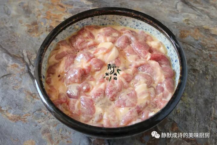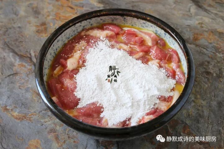 3、再徐徐添加红薯淀粉,不要试图一次加到位。我们这里要选择红薯淀粉,炸出来的是酥脆的。拌匀成稀糊状,用筷子夹起一片肉,液体不会滴落就好。