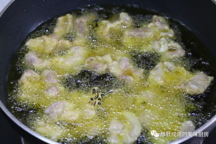 4、我用的是菜籽油,烧热后把挂好浆的肉片一片片地下到油锅里,中小火炸。