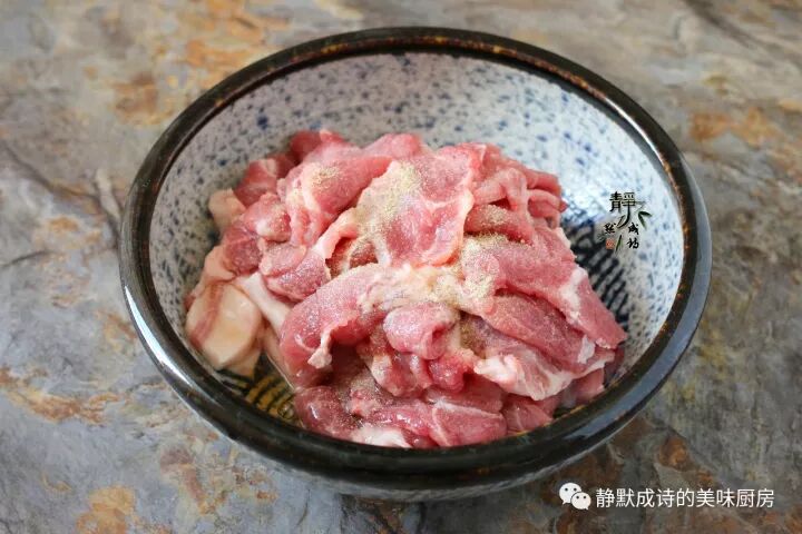 1、我选择的猪前腿肉,这里瘦中带一点点肥,炸出来很香。当然您也可以用里脊。先把猪肉切成薄片,加入黄酒、白胡椒粉、白糖、盐,把它拌匀,然后腌制上十几分钟,入个底味又去了腥。
