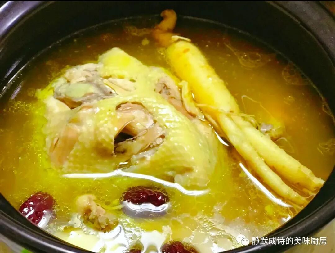 【原料】:鲜人参3根,母鸡1000克,姜1块,红枣5颗,枸杞 10克,清水适量,盐少许。
