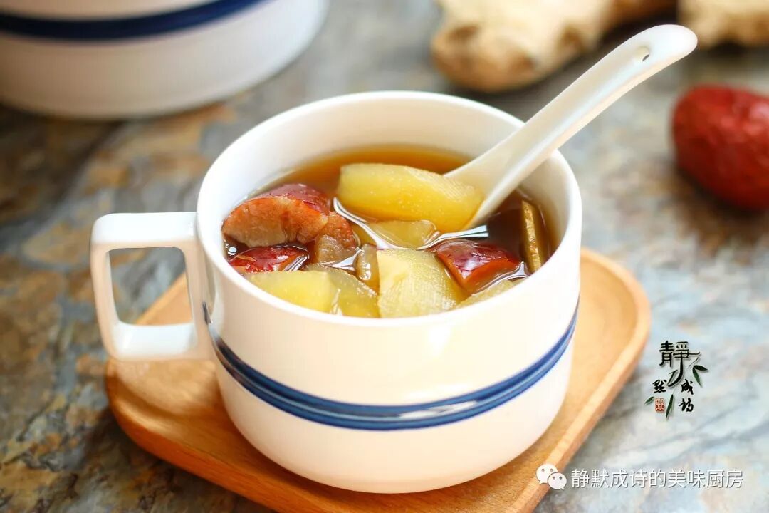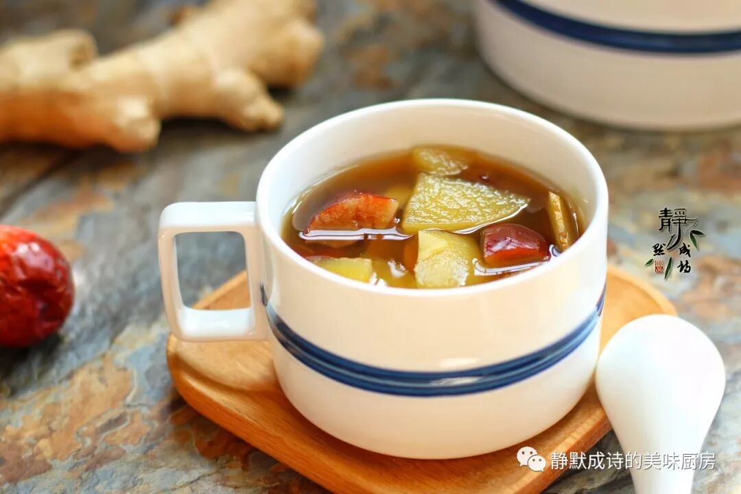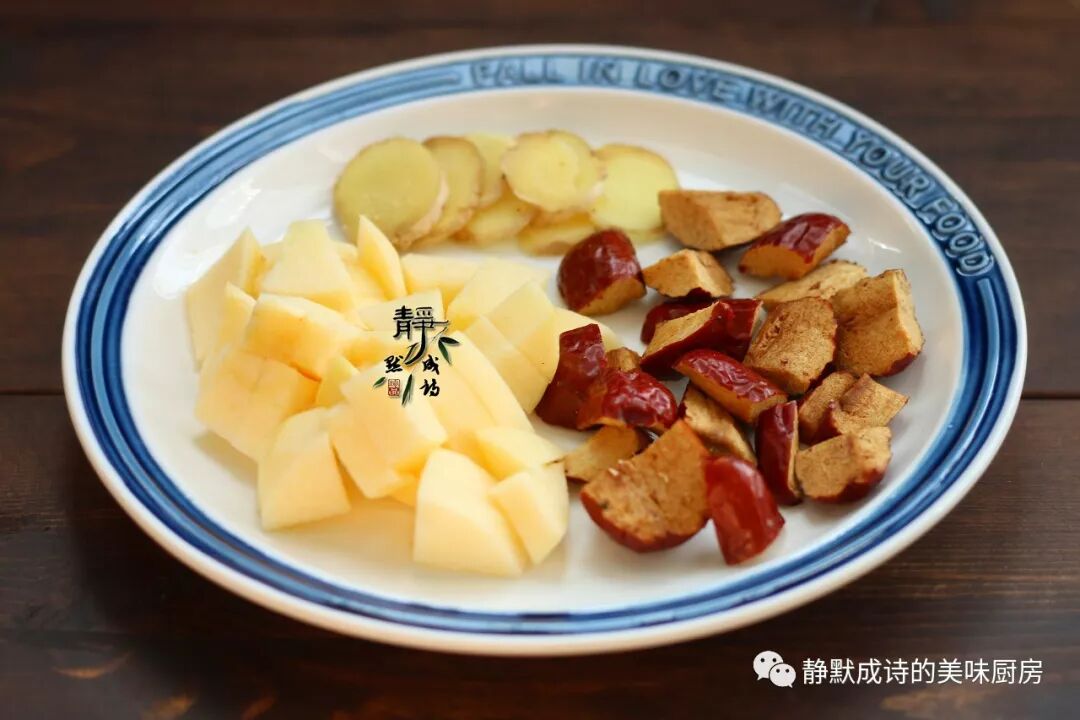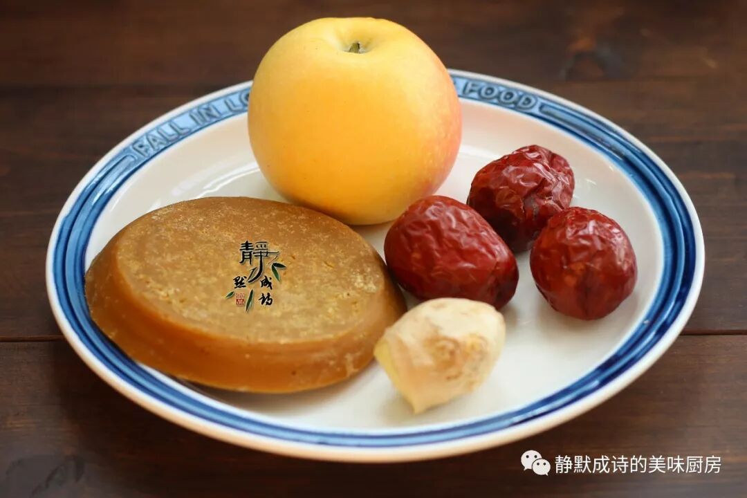 【食材】:苹果1个、红枣3-5颗、生姜1小块儿、红糖20克、清水适量。
