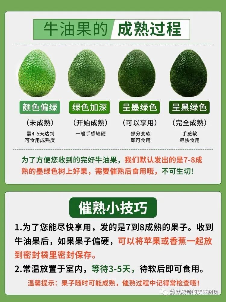 大家务必要知道,牛油果同猕猴桃一样,也是后熟型水果,收到后切不要马上放冰箱冷藏保存,不然就无法催熟了。它的催熟方法与猕猴桃一样,把牛油果与香蕉或苹果放一起,密封催熟,当用手指轻压有柔软感即表示它熟了,成熟的牛油果果皮能轻易剥开。已经成熟的牛油果需尽快食用,放置时间过长的话,其果肉会出现黑丝现象。成熟的牛油果可放冰箱冷藏保存并尽快吃完。