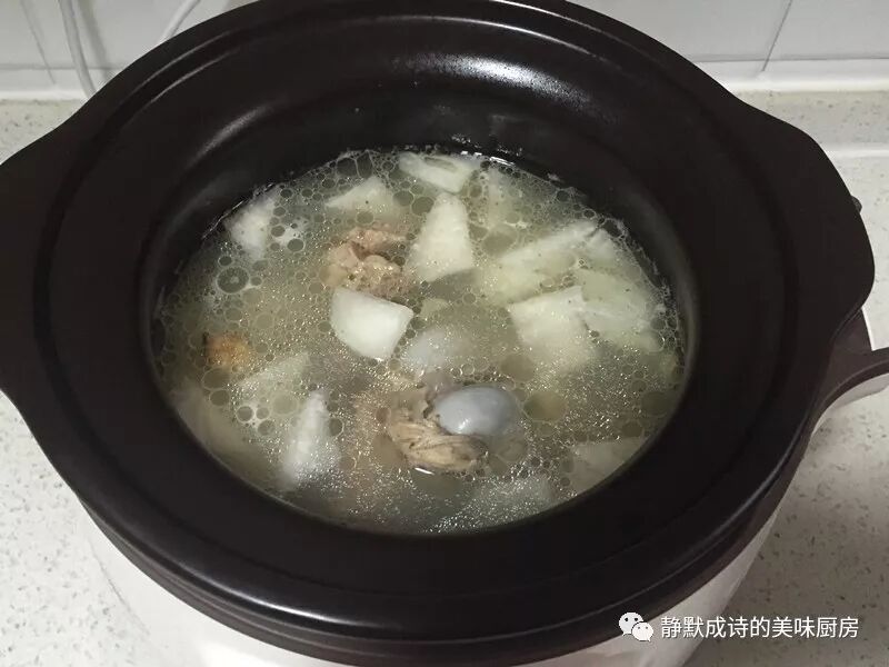 5、煲汤程序结束前半小时,把切好的白萝卜也放去,盖上锅盖继续煲半个小时。