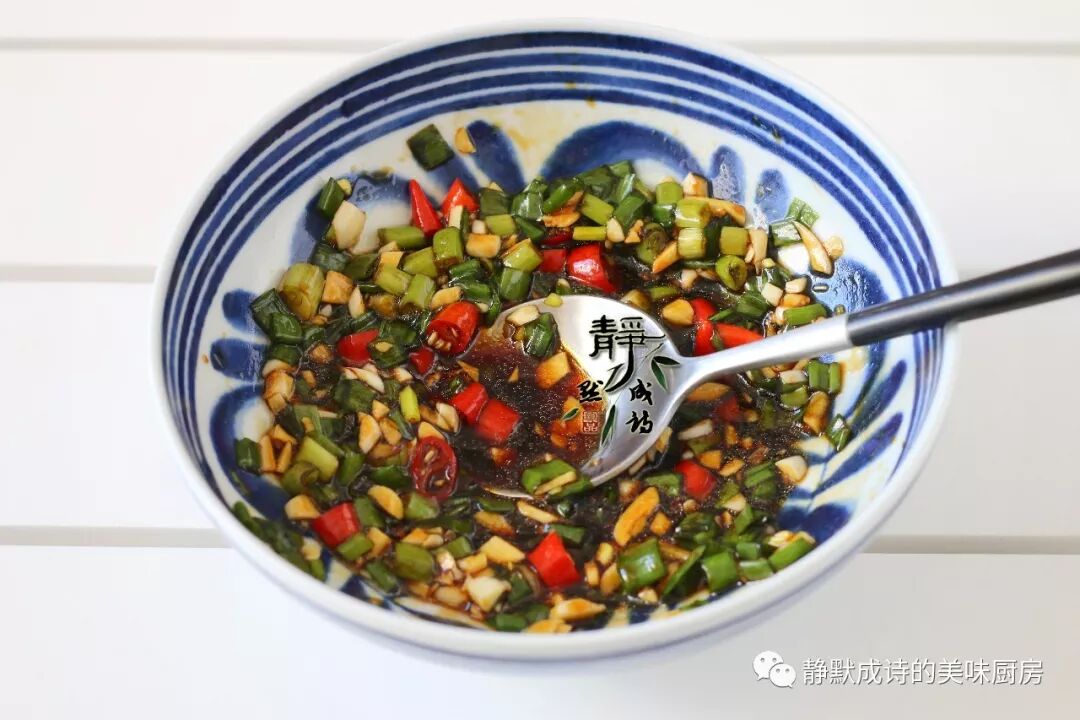 3、大碗中加入少许橄榄油,调入适量生抽、蚝油,把蒜末、香葱末和小米椒放进去,搅拌均匀。