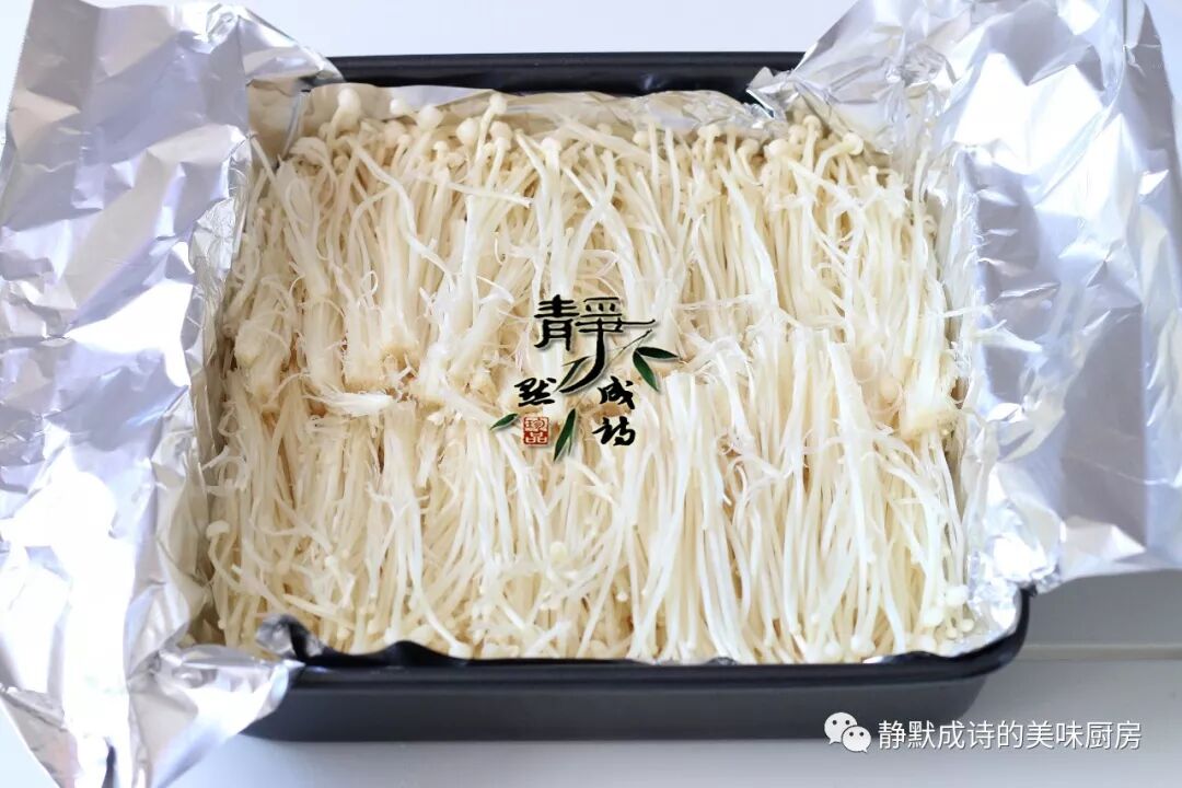2、金针菇洗净后放进烤盘前一定要攥干水分,不然会出很多汤影响味道和口感。