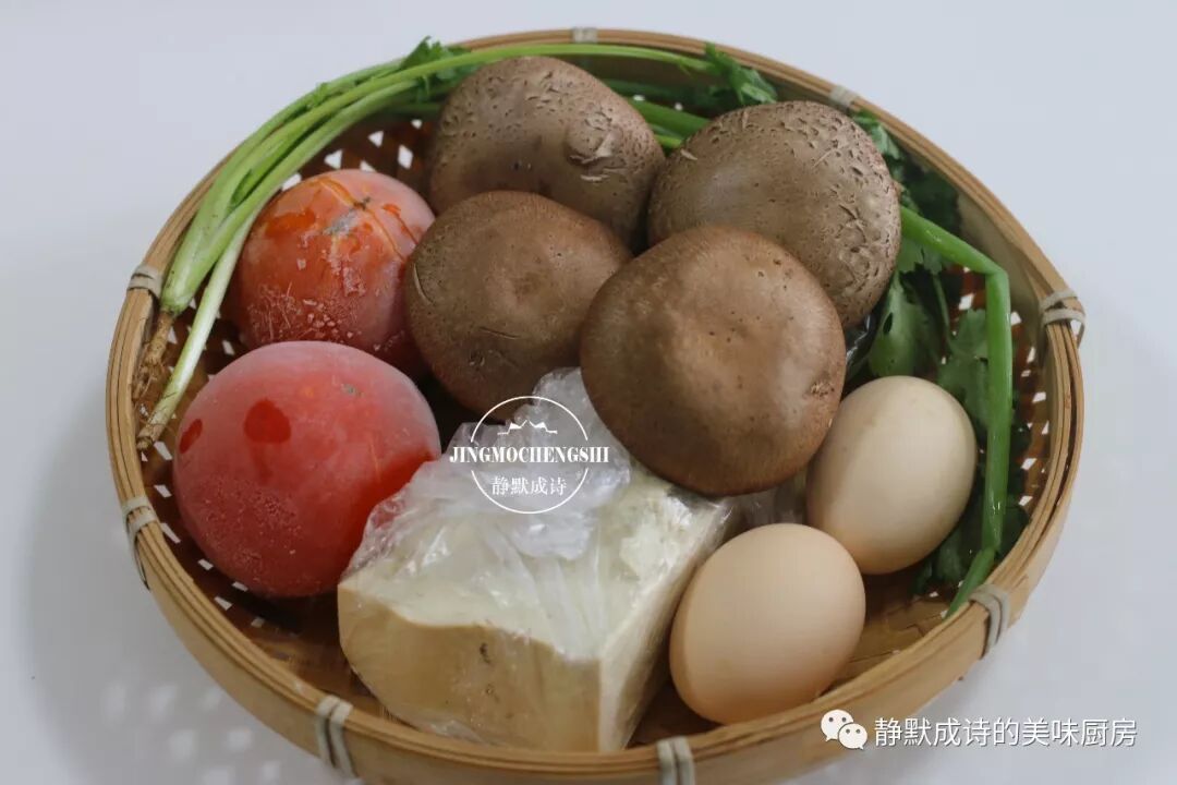 【食材】:西红柿2个、鲜香菇4朵、豆腐1小块儿、鸡蛋1-2个、香菜和香葱各1棵、白胡椒粉半汤匙、陈醋3汤匙、鲜酱油2汤匙、水淀粉适量、油盐适量。