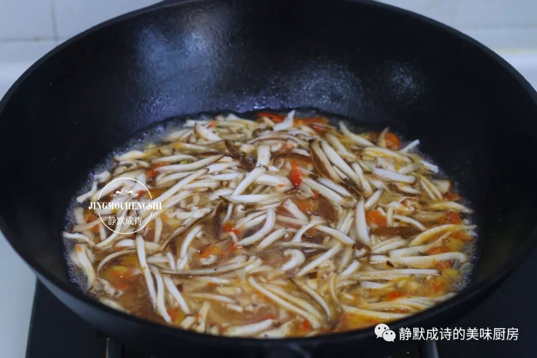 4、水开后下豆腐丝和香菇丝,煮上三分钟左右,调入酱油,让汤有个底色。