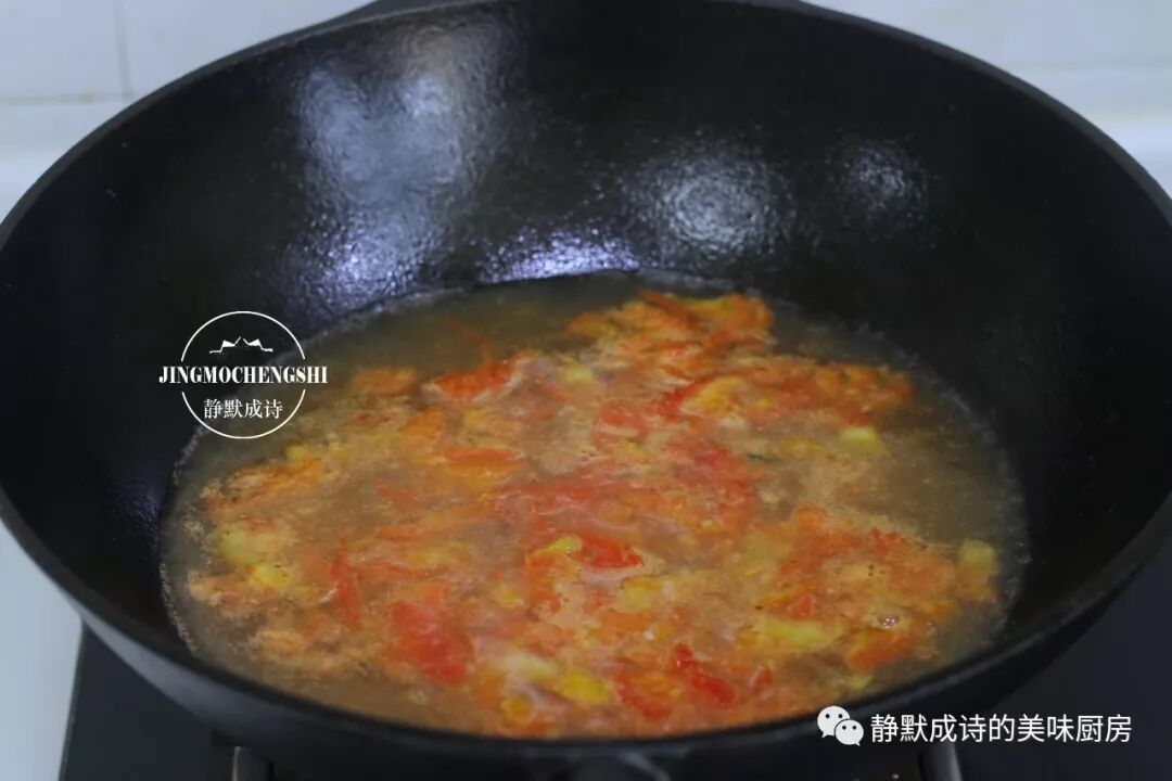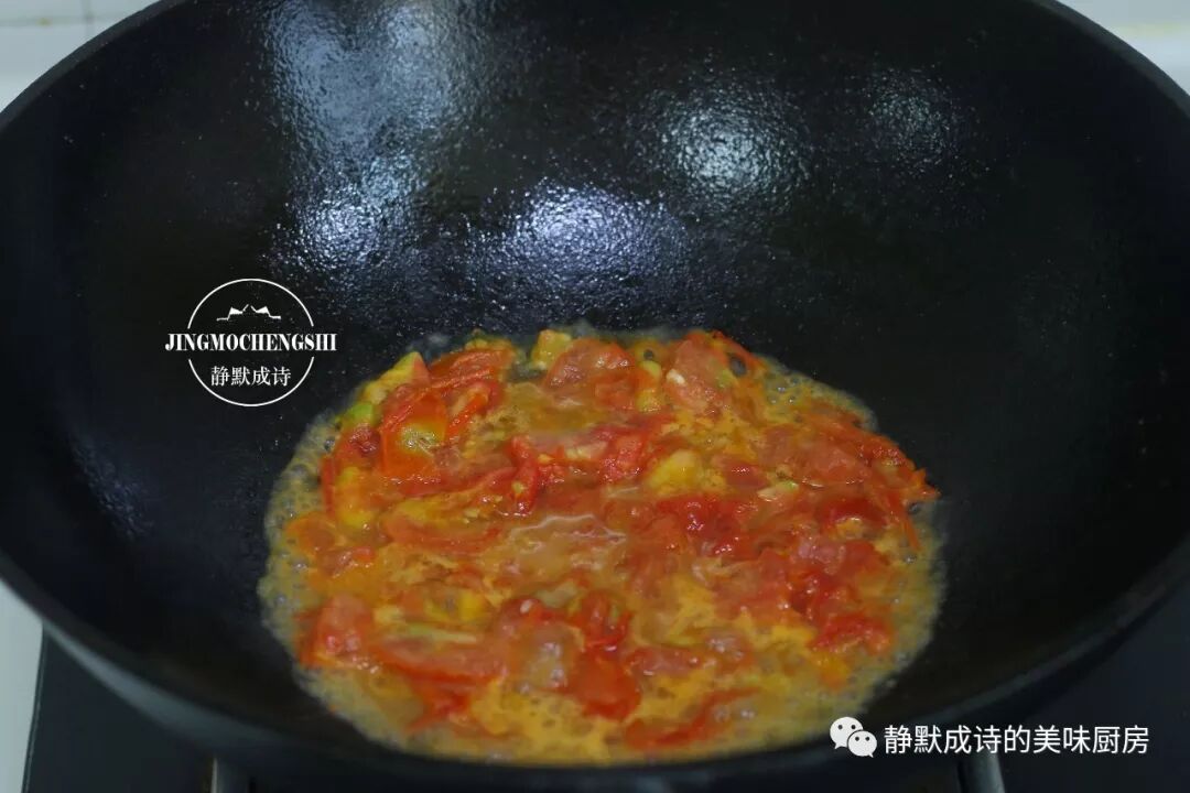 2、热锅热油,先下西红柿,小火煸炒出油。