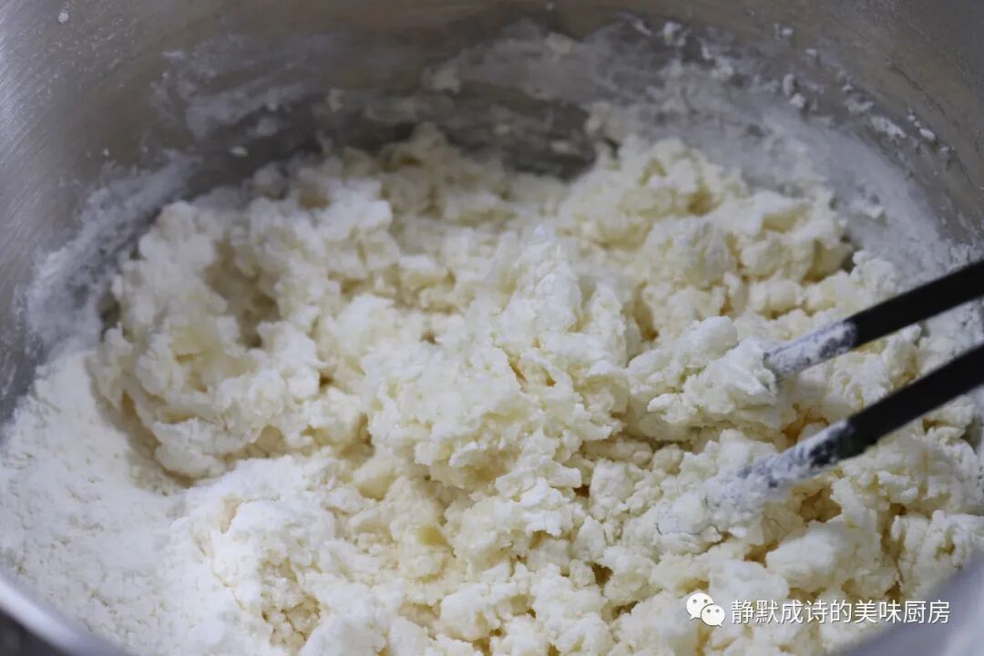 2、另外一半面粉用常温水,同样,搅拌成面絮状。