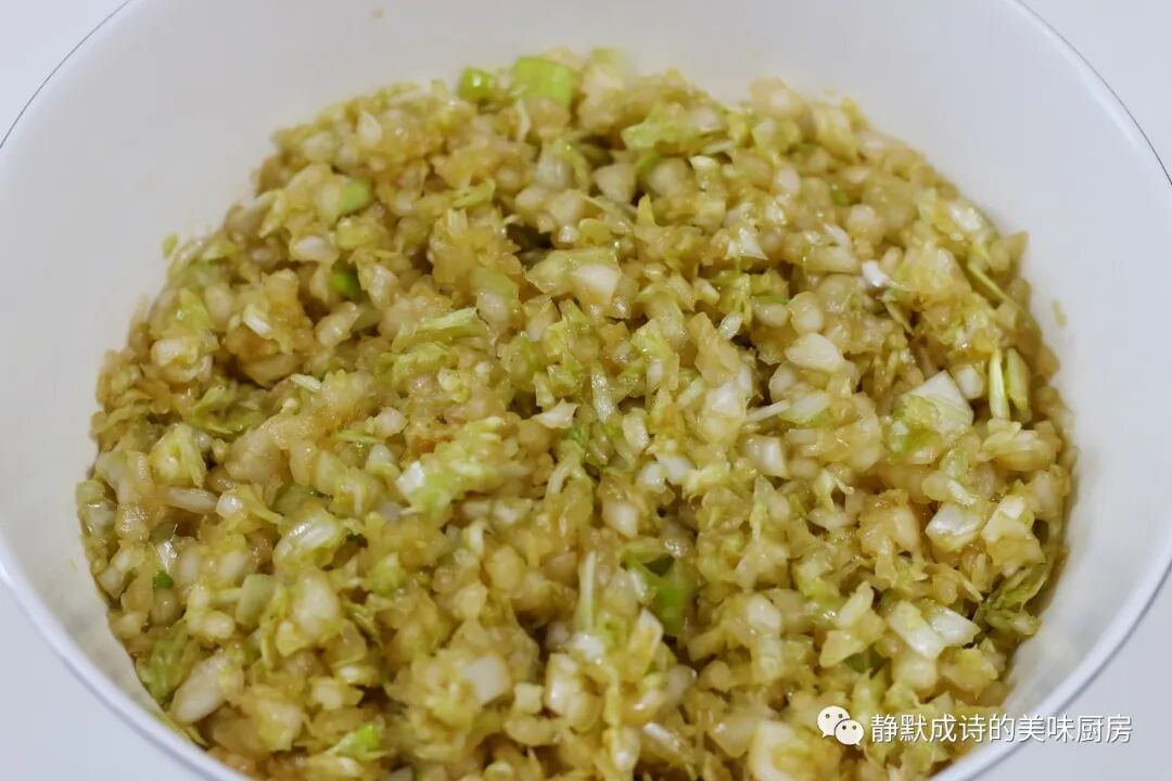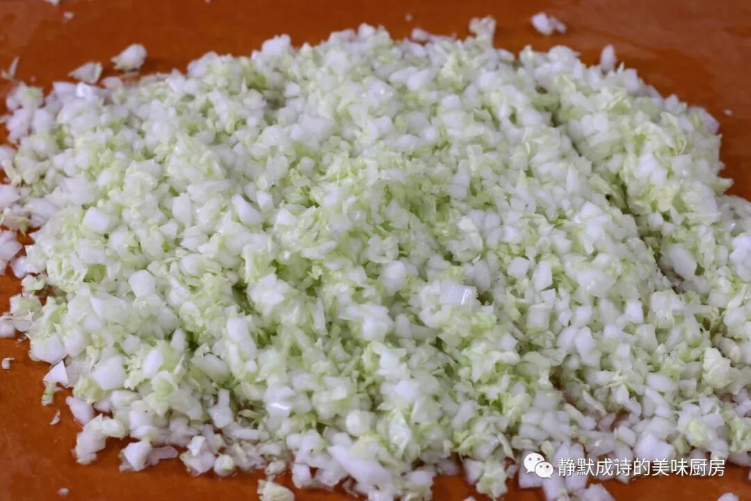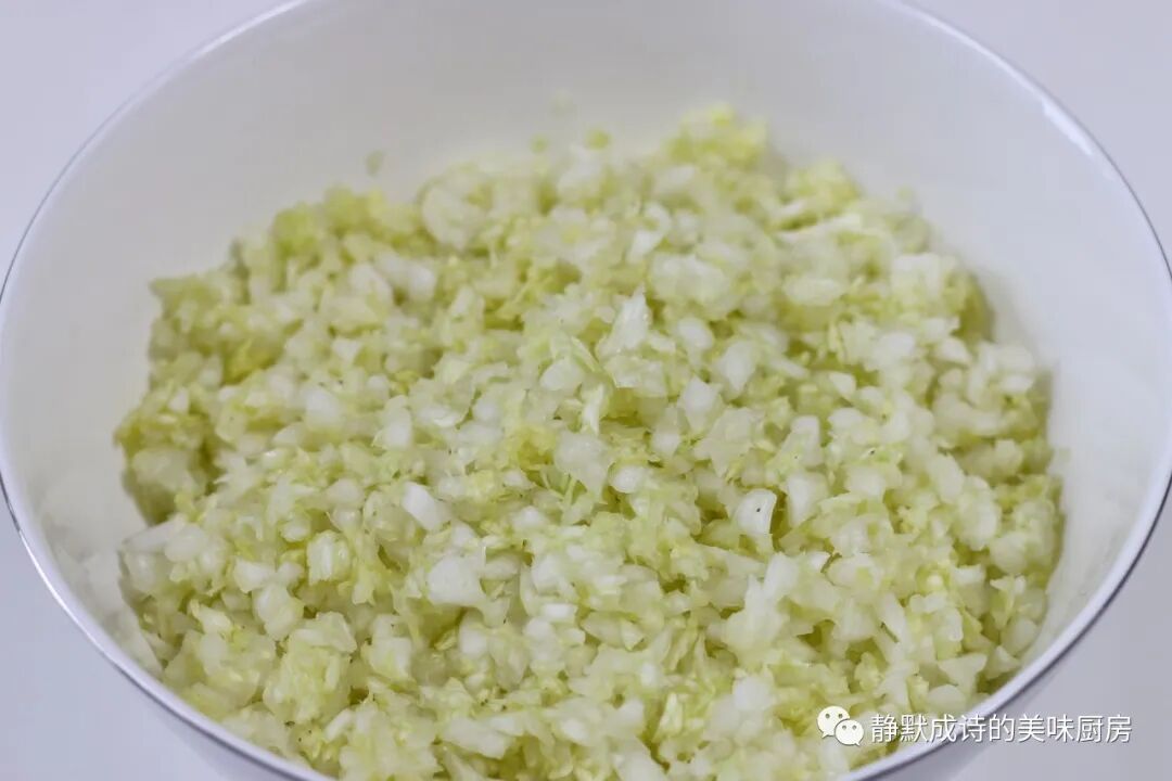 6、白菜不用剁太细,有颗粒感吃起来口感更好。挤掉白菜中的水分,放进大碗中。
