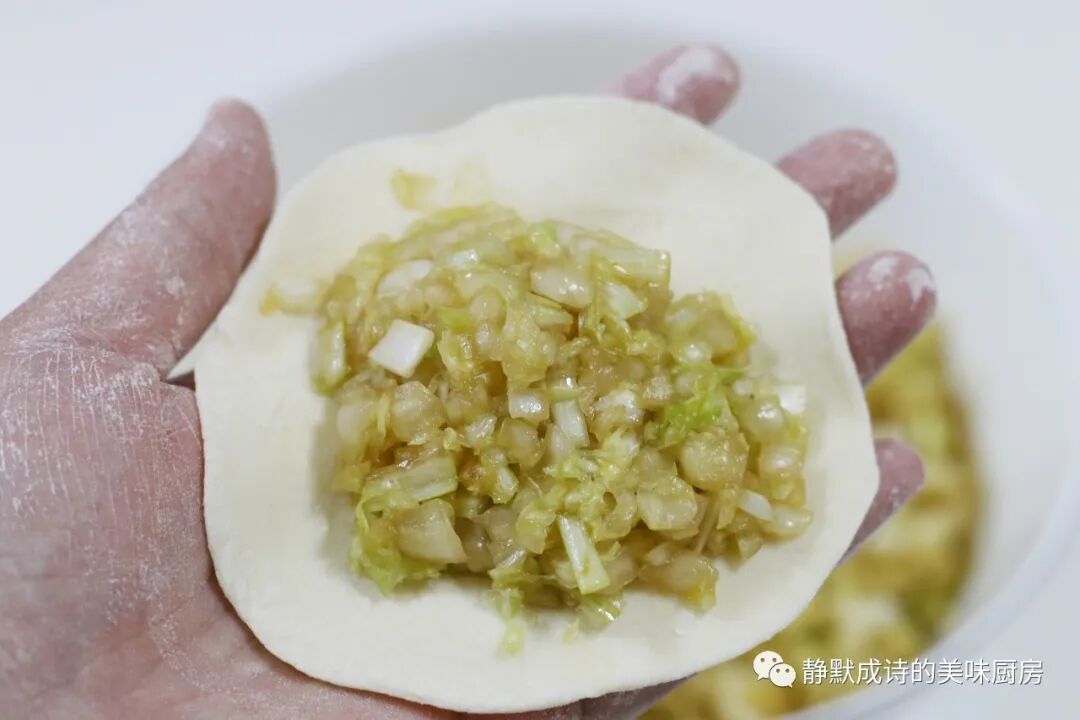 9、把松弛好的面团分成小面剂子,擀开,包入白菜馅儿。