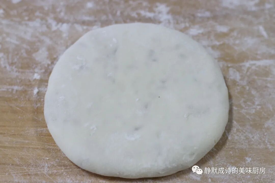10、包好之后轻轻擀开,两面都要擀,饼皮不会出现一面薄一面厚的情况。
