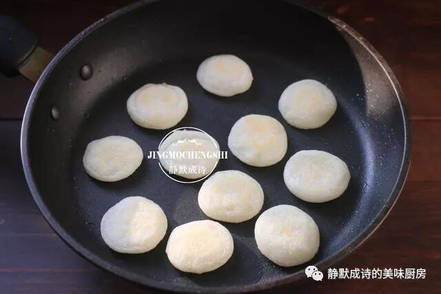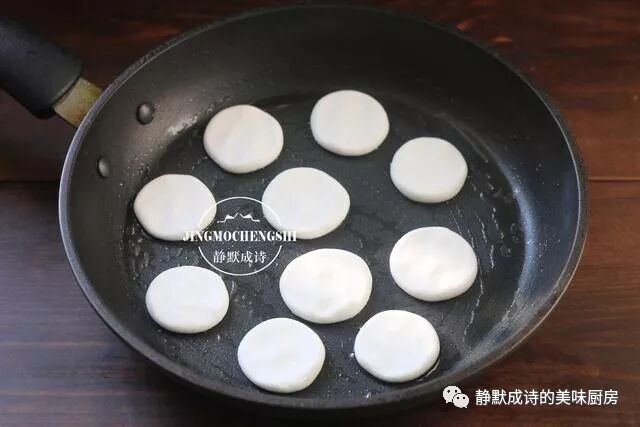 4、平底锅刷油,把做好的小圆饼全部放进锅中,要有间隔,防止在煎的过程中发生粘连,然后开小火开始煎。用煎而不是炸的方法,既省油又能降低热量。