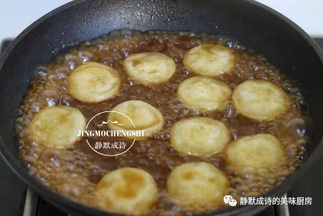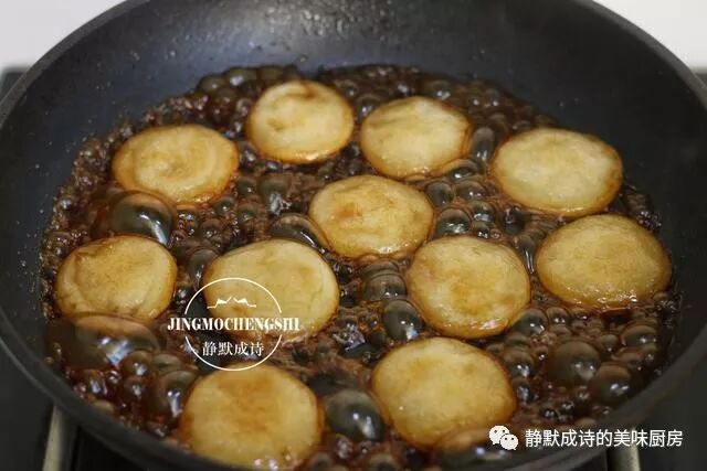 8、把煎好的糯米小饼全部放进红糖水中,转小火继续加热,注意翻动,本来煎至表面发脆的小饼,在糖汁的浸润下,会慢慢变软。