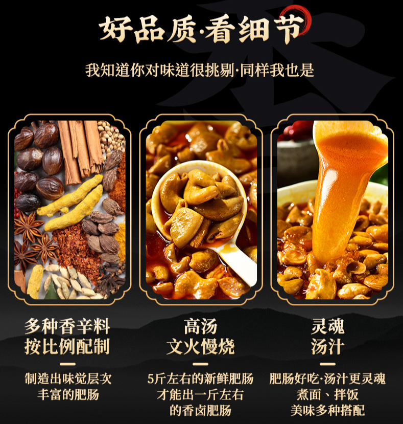 但诗乡肥肠的口感是有惊艳到我的,因为工厂经过大量实验,根据肥肠的制作情况,把控高温杀菌的时间,很好的避免肥肠因为加热过度而太老没有韧性。