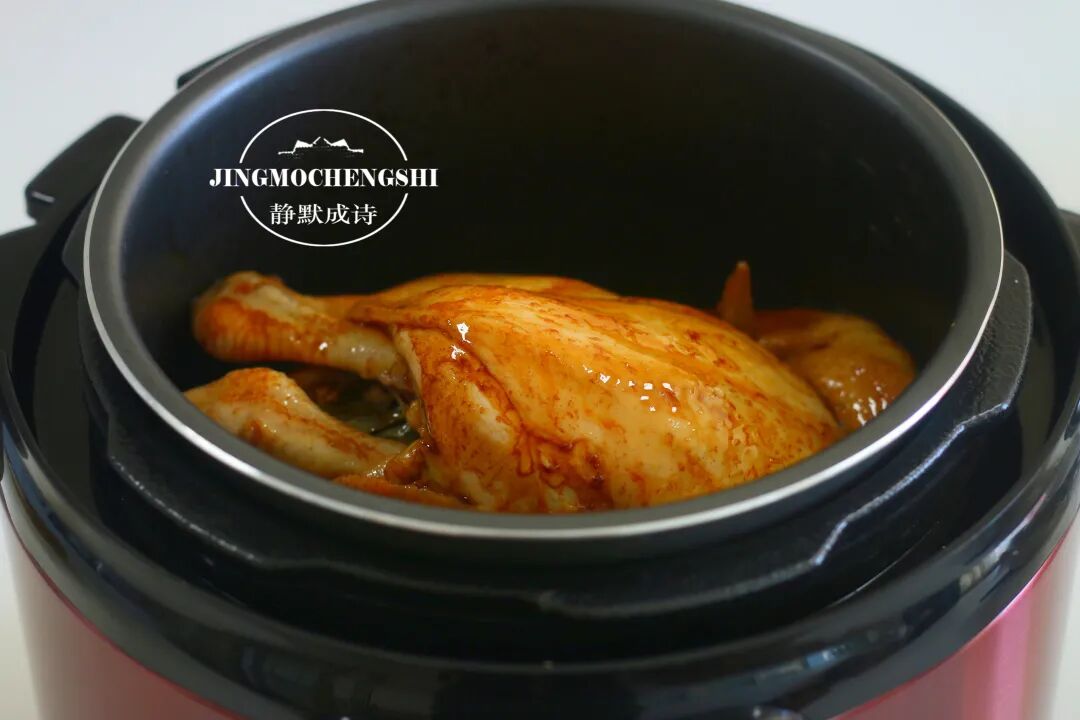 6、拿一只大碗,把鸡放进碗中,再把碗汁儿全部倒进去,给鸡全身来个按摩上色,然后放进高压锅。