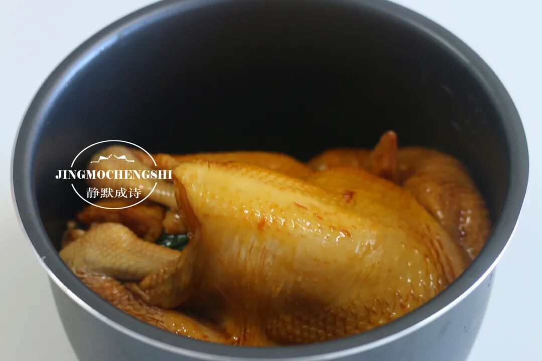 8、我用的高压力锅的鸡肉程序是12分钟,程序结束,让它自然排气,取出即可食用。汤汁千万不要倒掉,鸡肉内部入味小,边撕扯着鸡肉边蘸汤汁吃,或是下手把整只鸡拆开装盘,淋入汤汁即可享用。