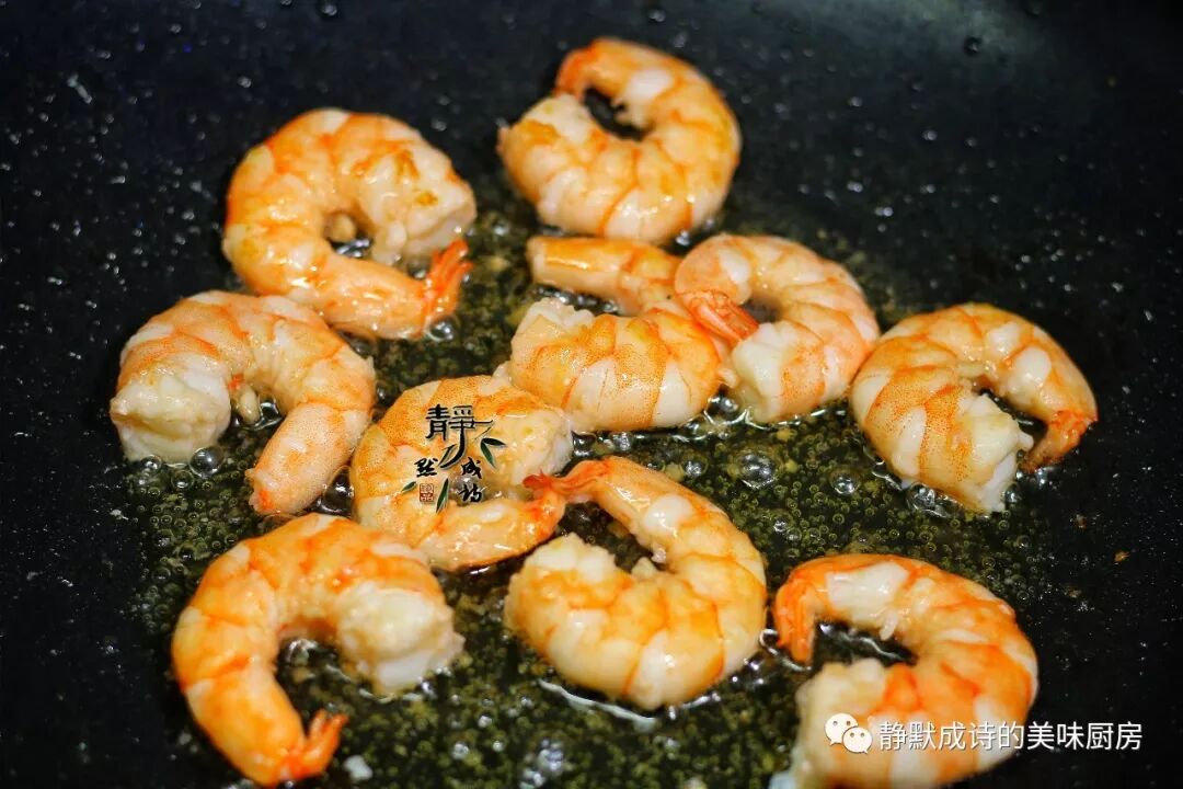 7、热锅少许油,下腌制好的虾仁小火炒至变色。
