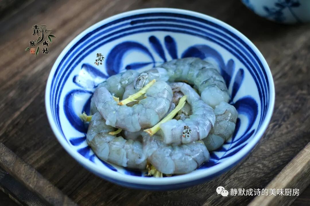 4、把整理好的虾仁再次洗净,用少许盐、几滴白酒、姜丝腌制一会儿以去腥,然后再用少许淀粉抓匀。