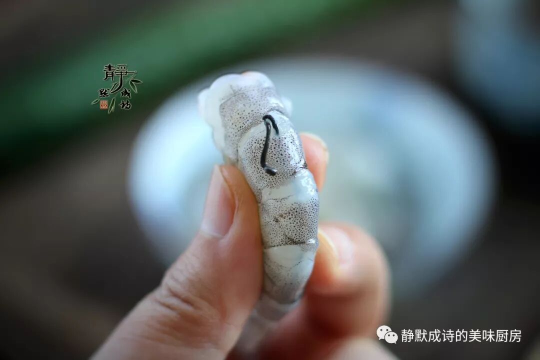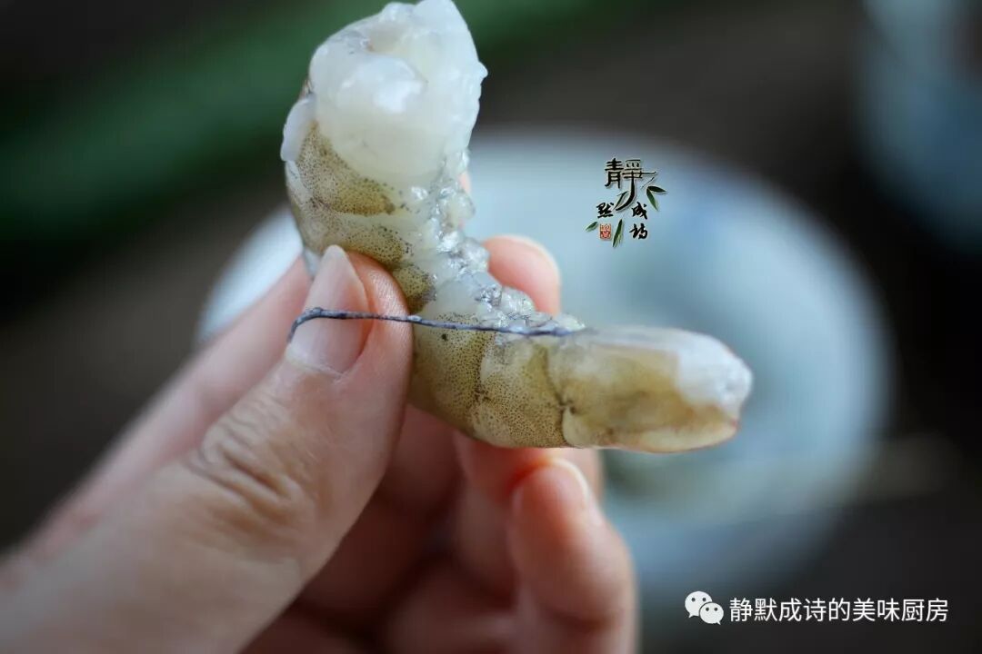 3、把虾仁腹部的黑线也挑出来扔掉,这条黑线是虾筋,其实它并不脏,您可以不去掉它,强迫症表示是一定要去掉的哈!