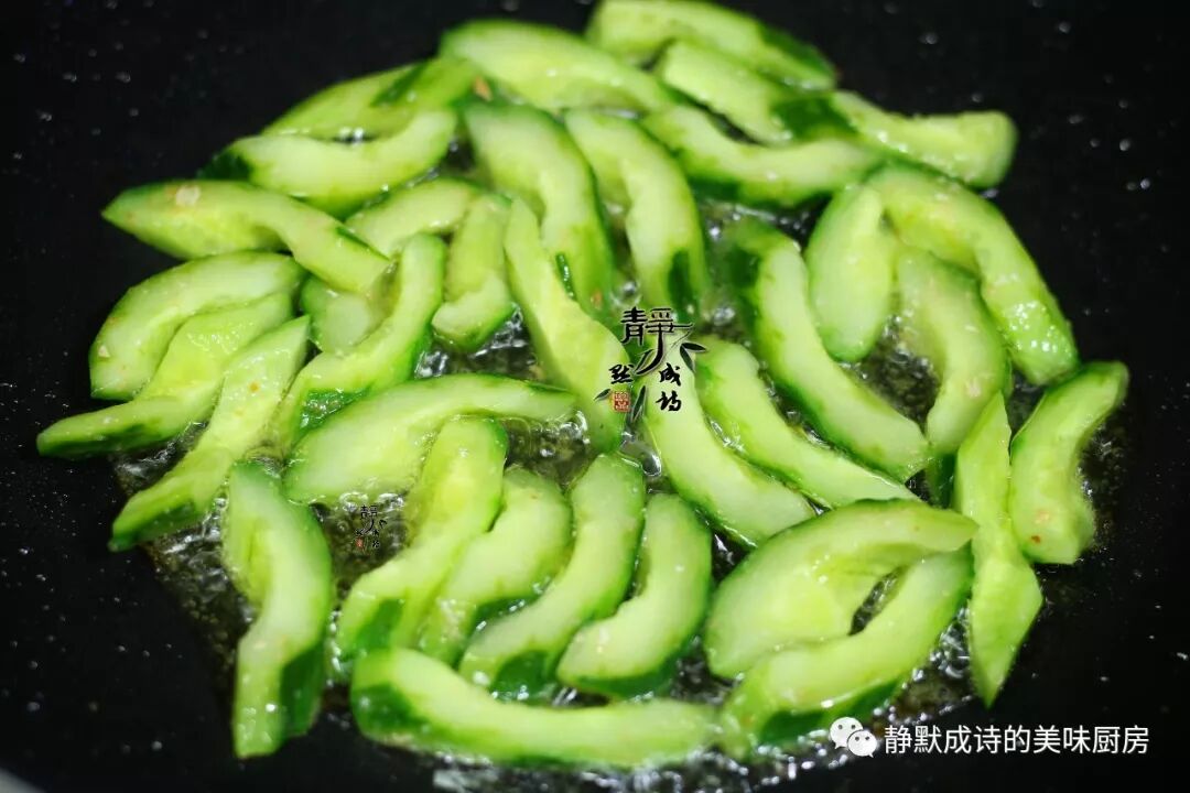 9、用锅中余油把黄瓜炒至稍稍变色。