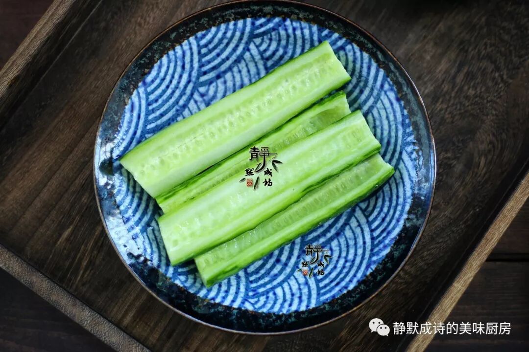 5、黄瓜洗净,用削皮刀削去外皮,外皮不要去的太干净了,留下一点点绿会比较美观。像给苦瓜去瓤一样把黄瓜的嫩苡用勺子挖掉。