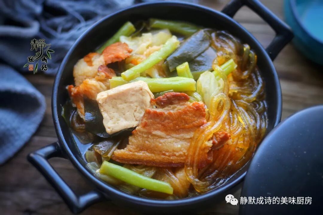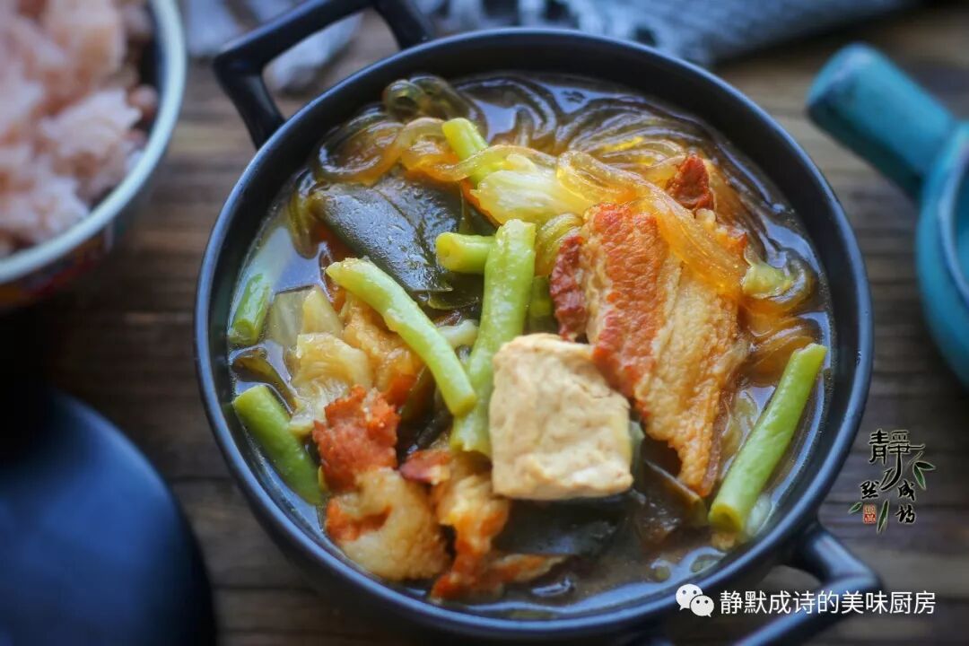 【食材】:带皮五花肉半斤至1斤、大白菜小半棵、豆角1把、海带少许、北豆腐1小块儿、红薯粉条1小把、葱姜适量、冰糖1小把、酱油1大勺、八角两个、香叶两片、油盐适量。