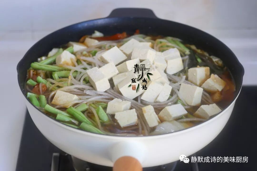 3、锅中加水不要太少,太少的话,粉条和豆腐做出来不好吃,用汤汁浸泡着的它们才入味儿。而且,粉条和豆腐都是易粘锅的食材,要把它们放在其他蔬菜上面防止粘锅。