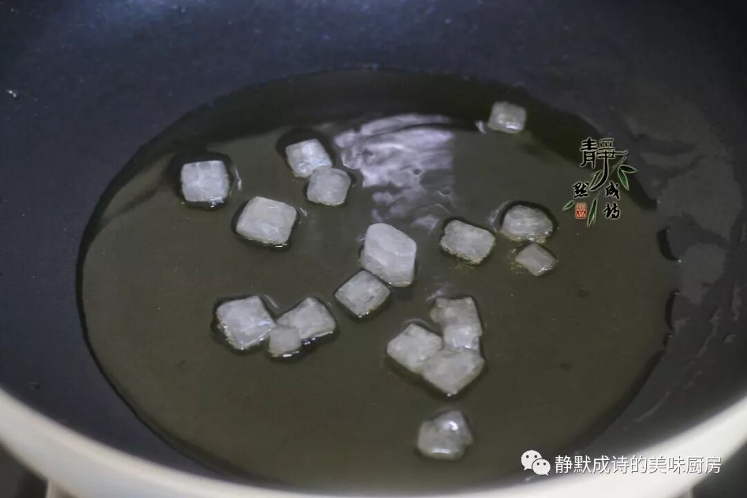 2、热锅凉油,冰糖凉油下锅,我们先来炒个糖色。