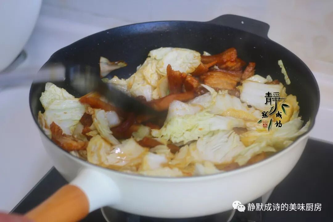 5、然后加入白菜,翻炒两三分钟,把白菜炒至微微发软。