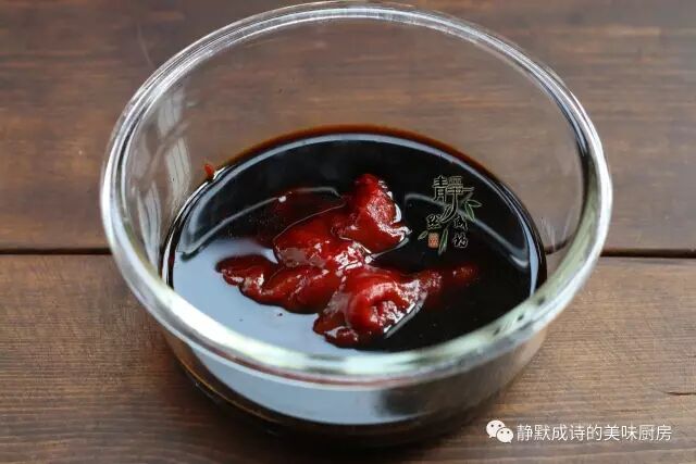 3、把文中材料中的蚝油、番茄酱、面酱、蜂蜜、生抽放一起,调匀成酱汁。