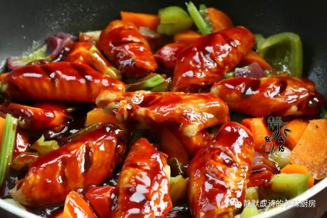 鸡翅400克、胡萝卜2个、芹菜2棵、青椒1个、洋葱1个、大蒜2头、番茄酱1汤匙、蚝油2汤匙、面酱(或是黄豆酱)1汤匙、蜂蜜1汤匙、生抽2汤匙、黑胡椒碎少许、姜1小块、黄酒2汤匙、橄榄油适量。