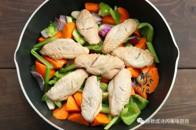 4、取平底不粘锅,锅中倒入比炒菜稍多些的油,把蔬菜全部放进去铺平,然后把鸡翅码在最上面,腌制鸡翅时的姜丝什么的全不要,只留下鸡翅。再一个,容易成熟的蔬菜可以选择后放。